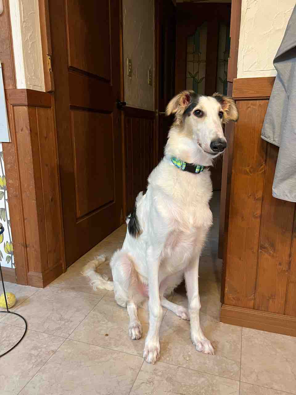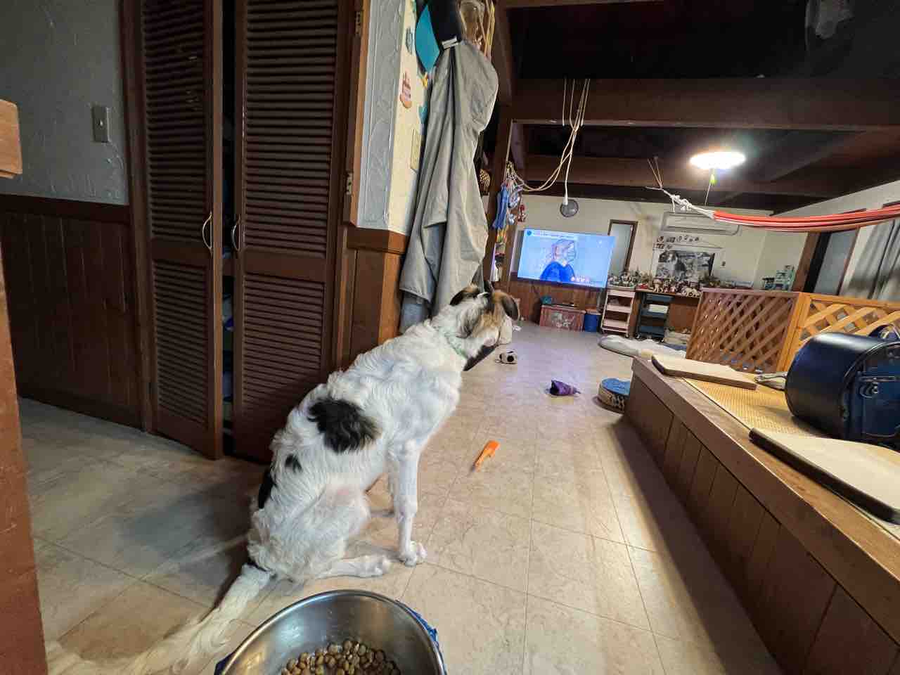 何か分からないけど…ビビってキッチンの方で座るターボ