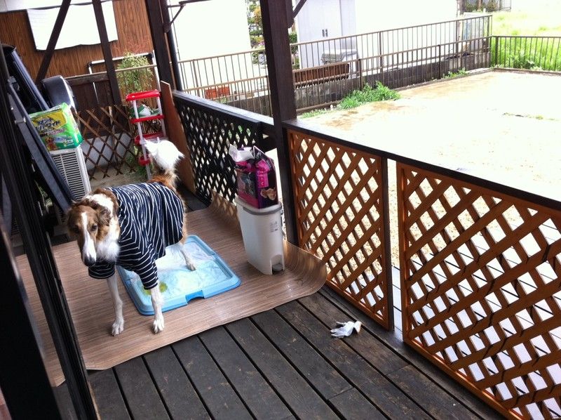 の日は足がドロドロになってお家が汚れるので、デッキのトイレシーツの上で