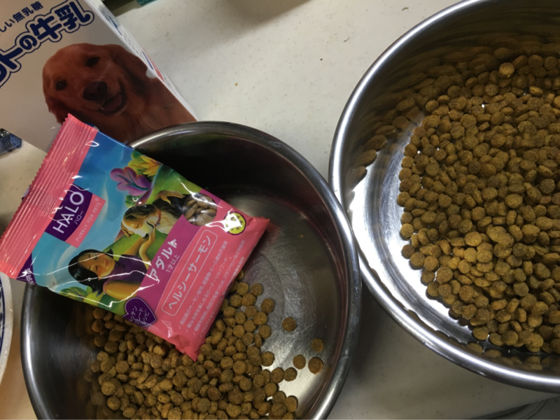 この前わんにゃんドームでもらった試供品フードを半分入れてみました
