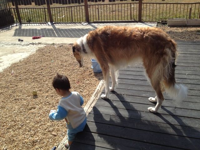 43kgのボルゾイが赤ちゃんに足蹴りくらって