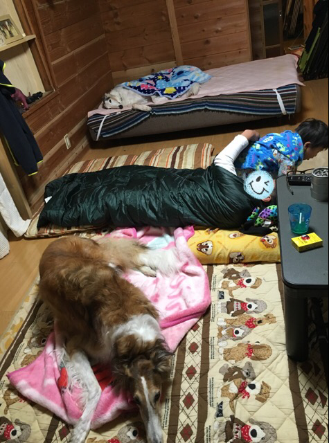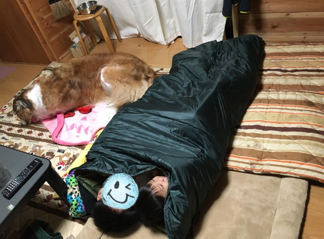 父ちゃん&ルネ、母ちゃんが寝る用の寝袋をお試し中