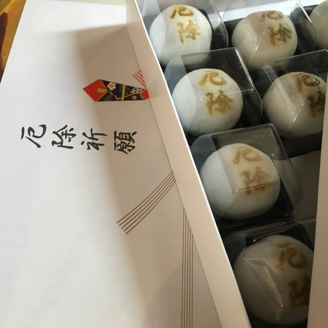 この辺では、お祓いしてもらったお饅頭を配る風習があります。(身内と厄年の人&家族は食べれません)