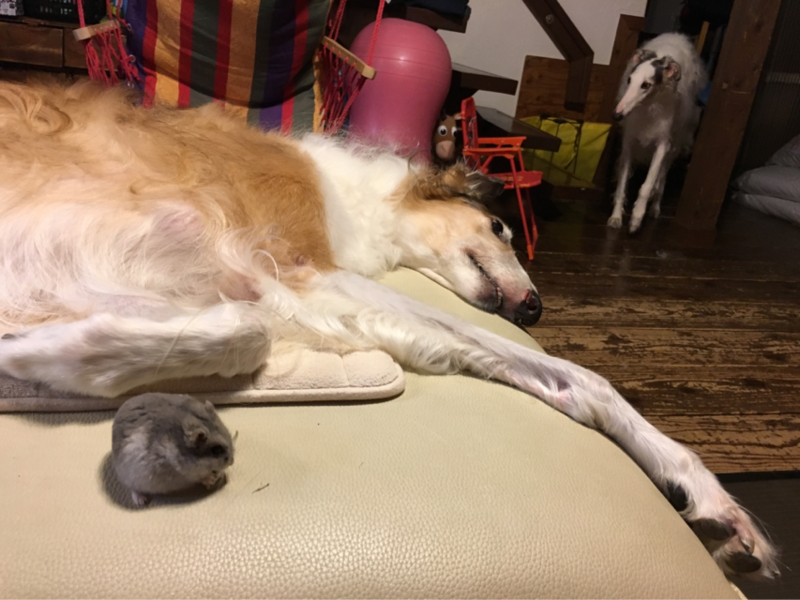 凶暴犬って思われてしまったボルゾイのお尻の下にハムちゃん