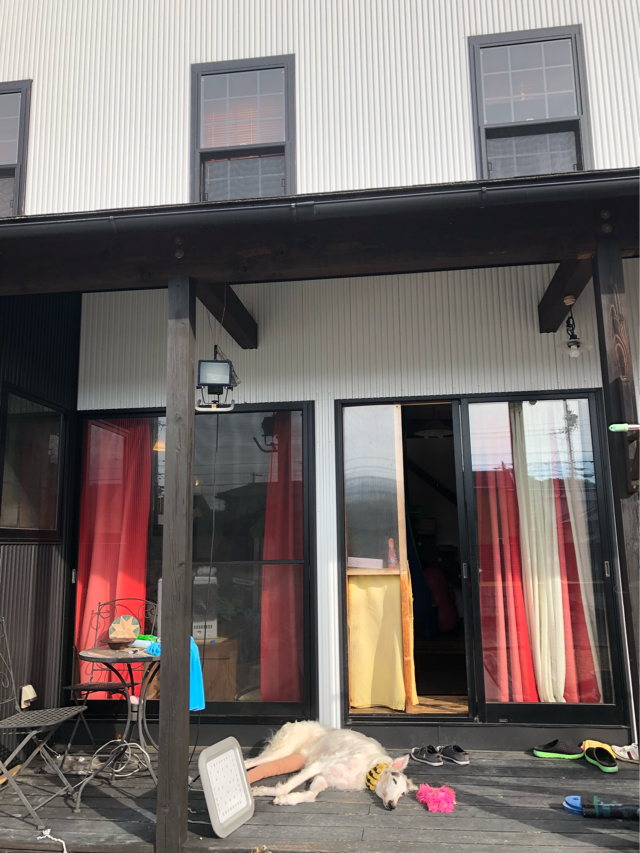 に行って、中に戻ろうとしたら、デッキの上に寝転んだので...