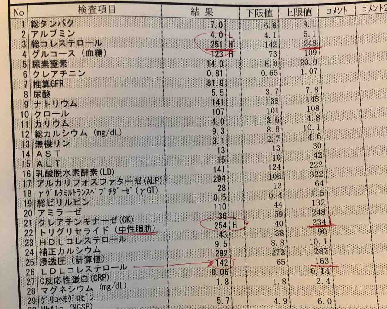 血液検査の結果は、総コレステロール値と中性脂肪数値が高かったです(これは前から分かってました)