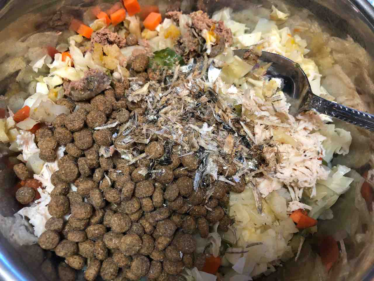 鶏ささみ、鶏レバー、煮干し、ニンジン、キャベツ、カリフラワー、オクラ、カボチャ