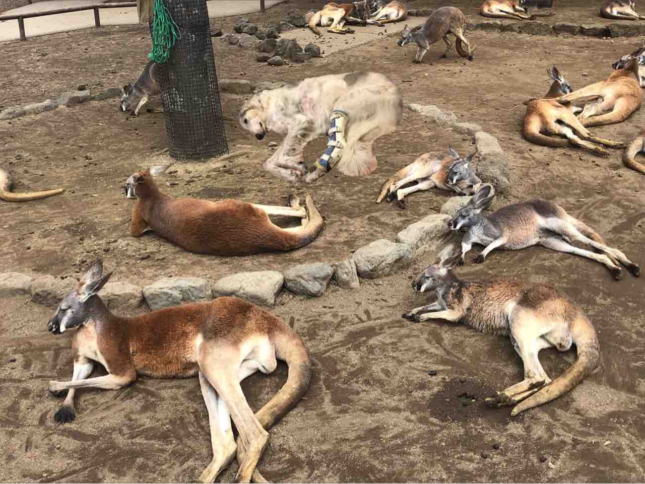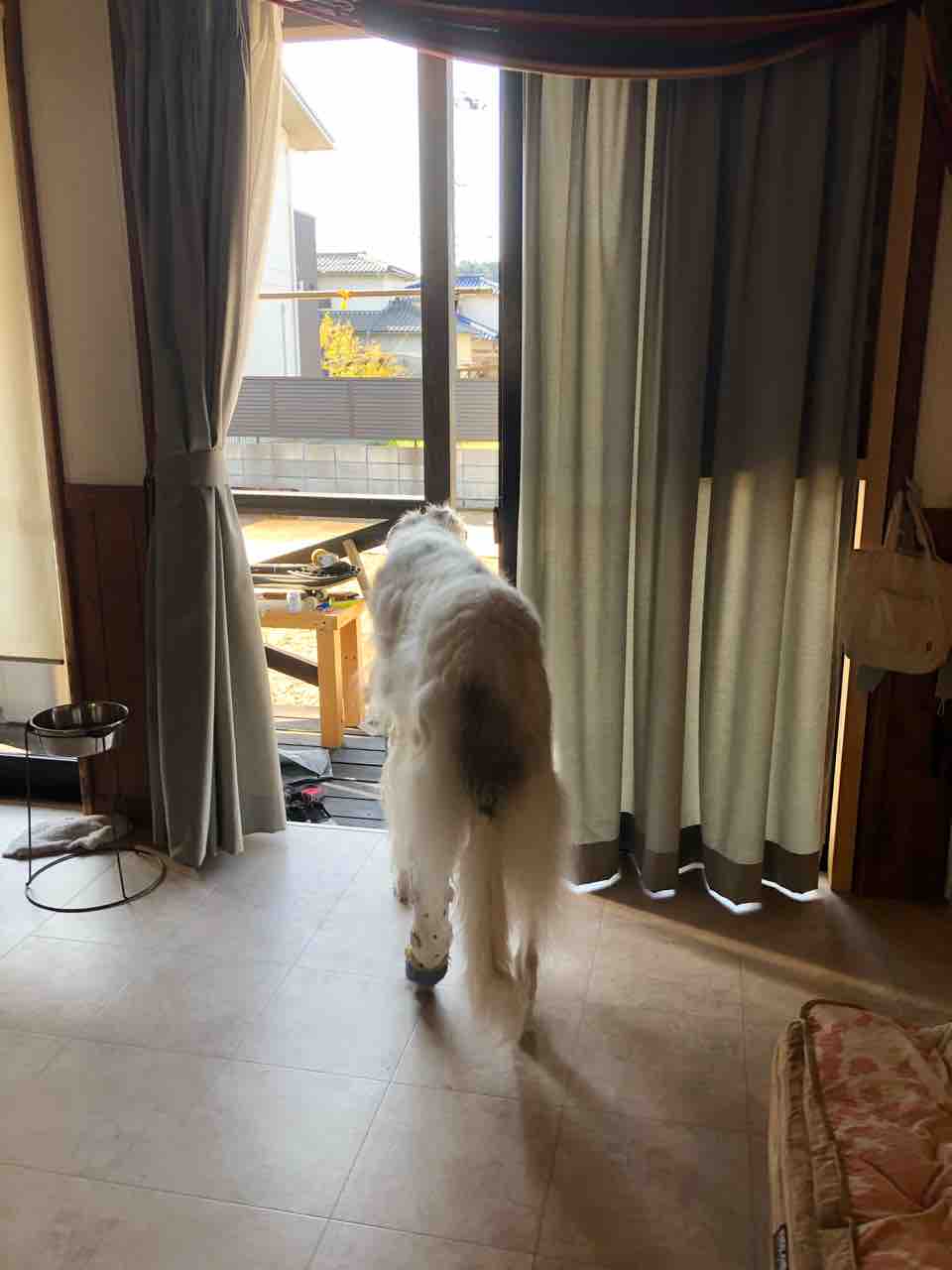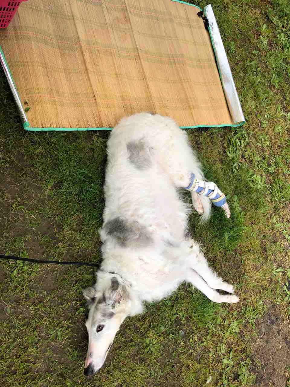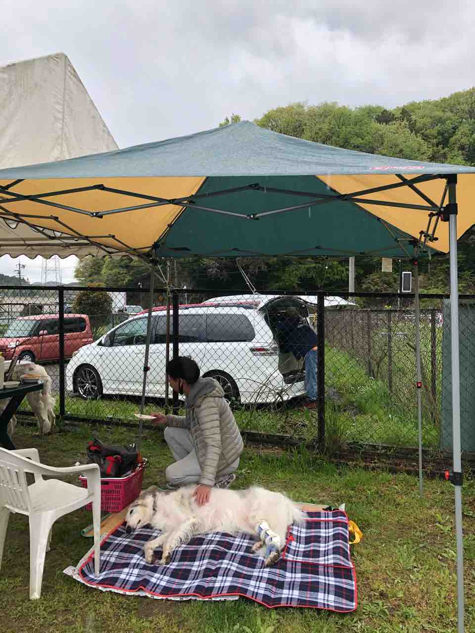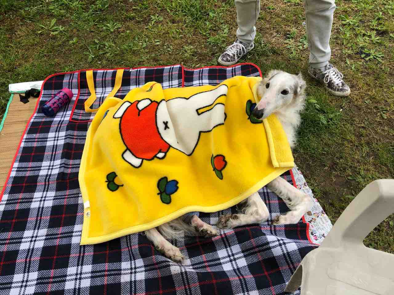 休ませようと敷物敷いたのに、横で寝転がっちゃった